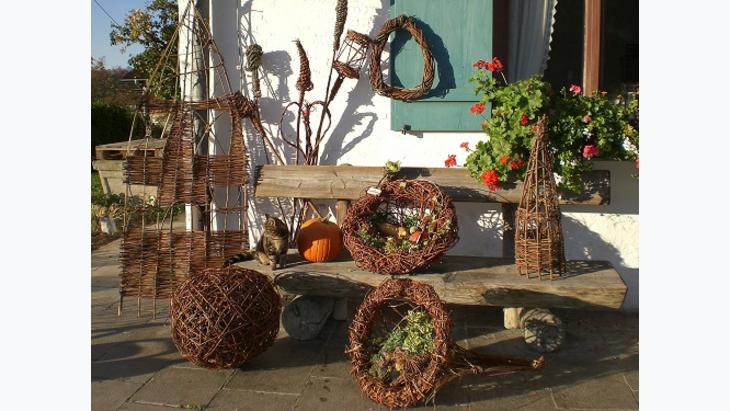 Das Weidenflechten ist ein altes Handwerk mit einer über 2000-jährigen Tradition, welches heute noch genauso fasziniert wie damals. Mit der Gartenbäuerin zusammen flechten Sie aus den biegsamen Weidenruten Ihre jeweiligen Wunschobjekte wie Körbe, Kränze, Kugeln, Obelisken, Sichtschutz oder Fahnen. Mitgebrachte Gegenstände wie Weckgläser, Glasperlen, Ton- und Keramik-Deko können mit eingearbeitet werden. Der Kreativität sind keine Grenzen gesetzt!